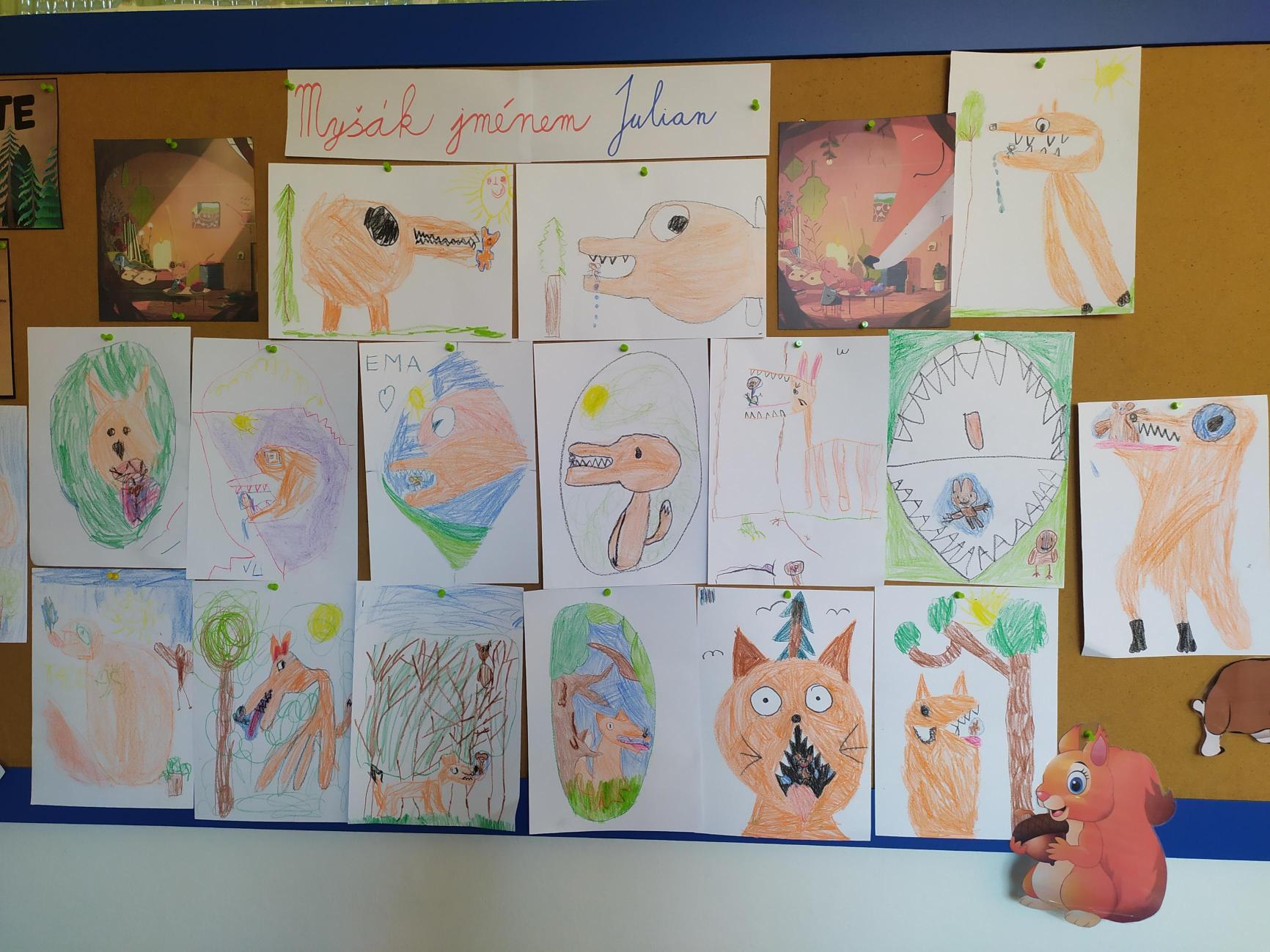 Nejprve „vyčetli“ ze dvou obrázků řadu informací a poté zkoušeli seřadit, který z obrázku bude na začátku, který na konci a vysvětlily proč si to myslí. Pomoci naslouchání řadili jednotlivé obrázky příběhu, předvídali, jak se asi myšák zachová, jaké má pocity nebo jak celý příběh asi dopadne. Nakonec ve výtvarné výchově Juliana a jeho nového kamaráda nakreslili. Vážně se jim to moc povedlo.