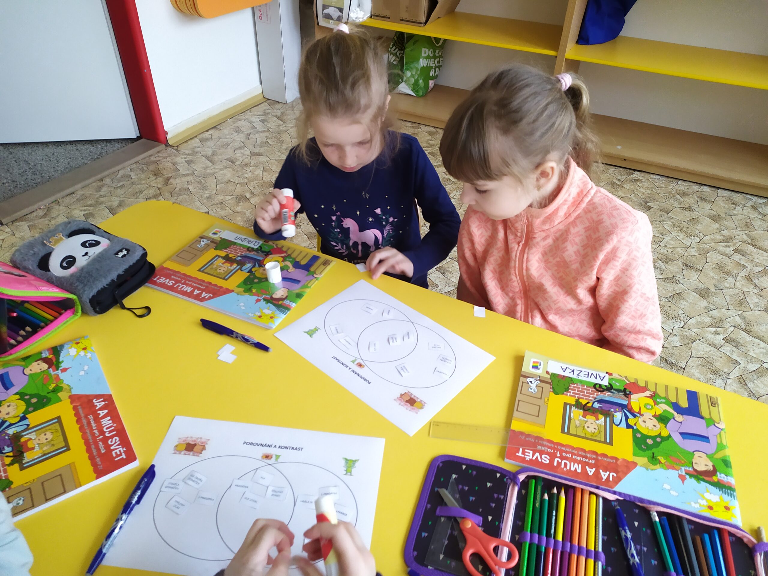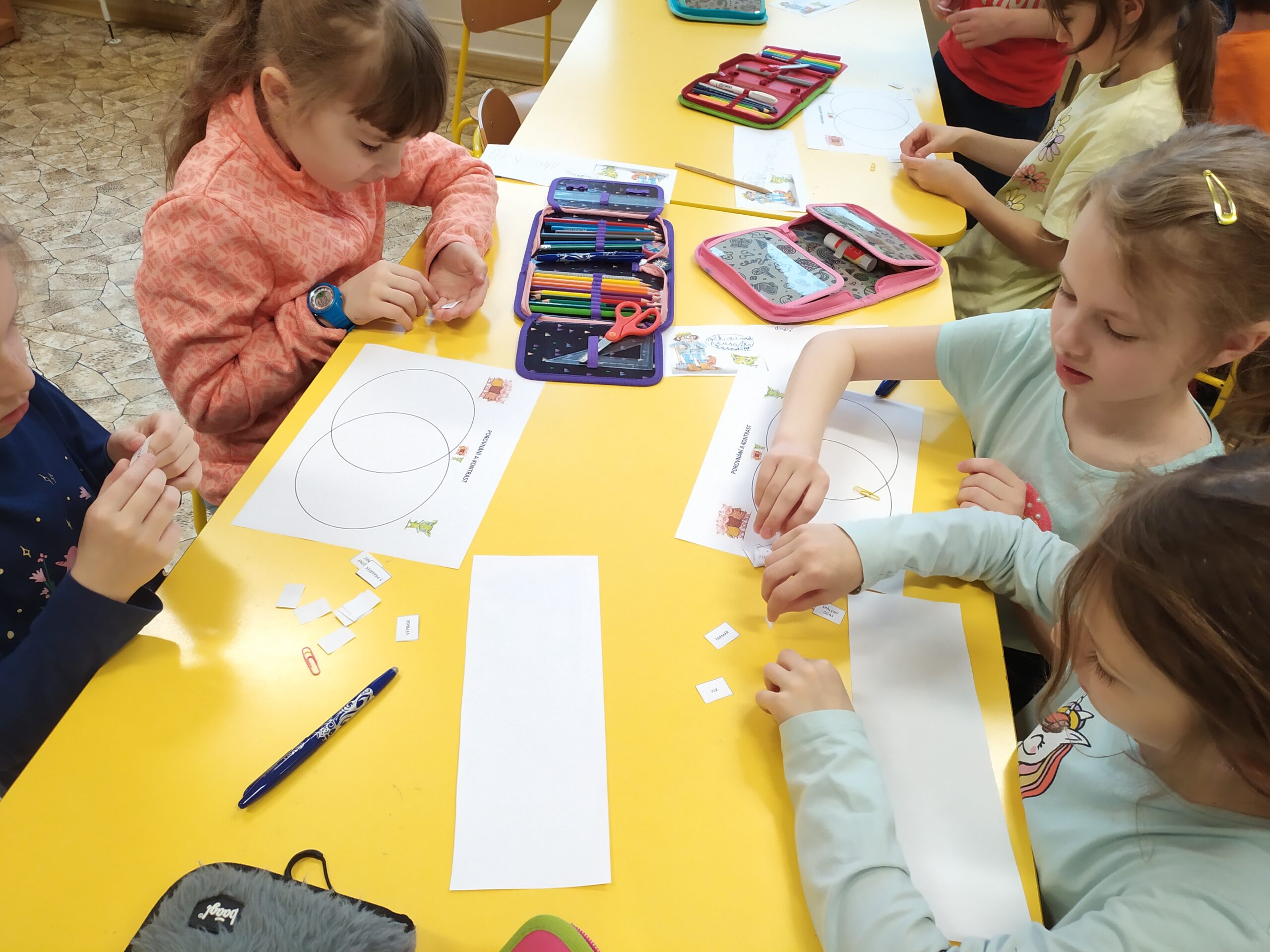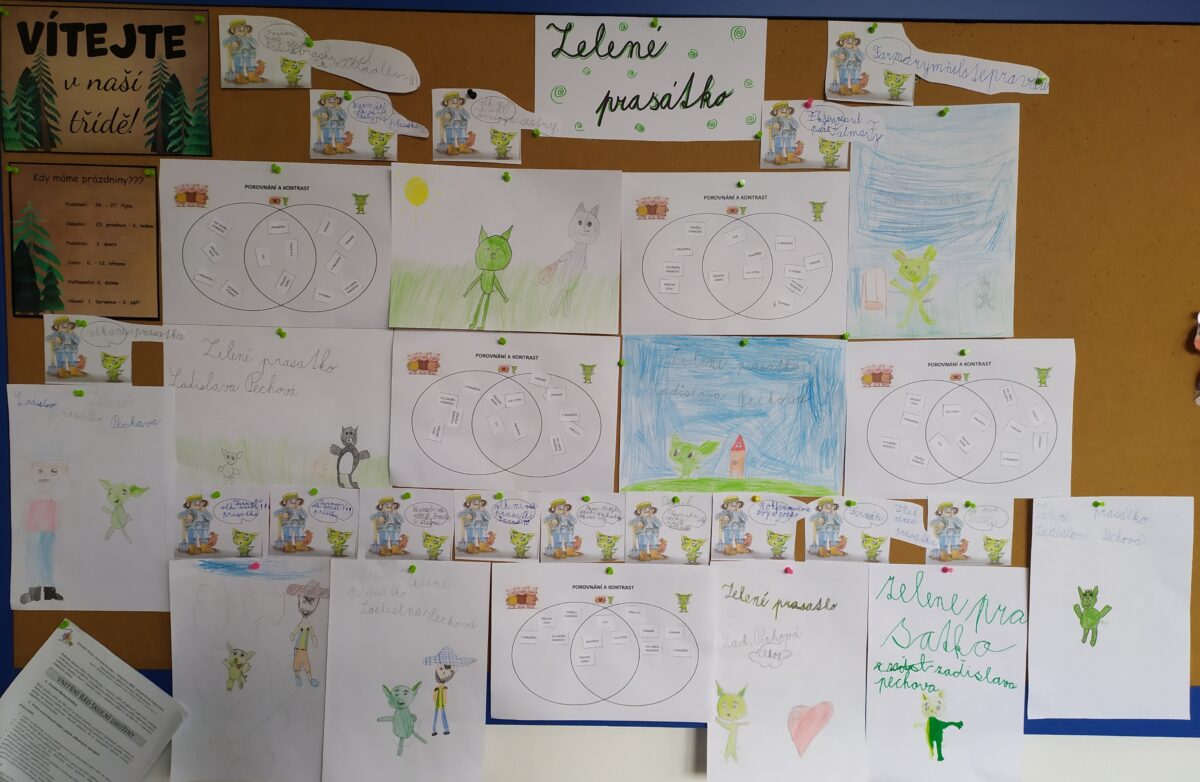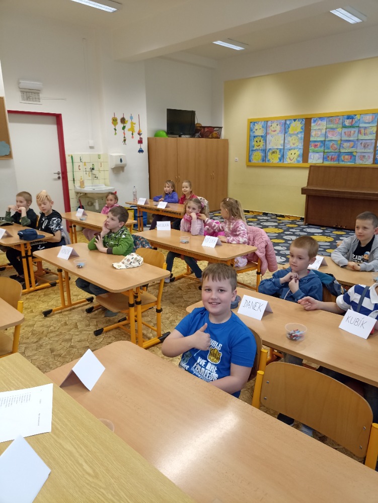 V tomto školním roce jsme se na prvním stupni kromě jiného zaměřili na rozvoj čtenářské gramotnosti žáků. Jedním ze základních cílů bylo motivovat děti k četbě knih, což nejvíce napomáhá k rozvoji čtenářských dovedností. Pochopitelně prvňáček, který ještě neumí číst, si knihu sám nepřečte. A tak jsme pro děti v 1. třídě připravovali takové aktivity, aby i ony mohly svou čtenářskou dovednost postupně rozvíjet a aby, až budou umět číst, si knihu mohly přečíst samy. Zpočátku jsme především pracovali s klíčovými obrázky a klíčovými slovy, pomocí nichž děti odhadovaly, o čem bude příběh, který jim paní učitelka přečte. Žáci si poté text poslechli a následně odpovídali na jednoduché otázky týkající se děje.