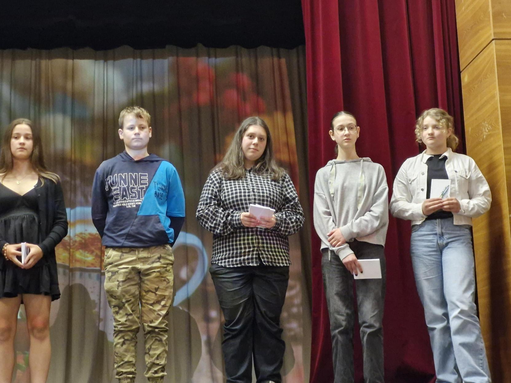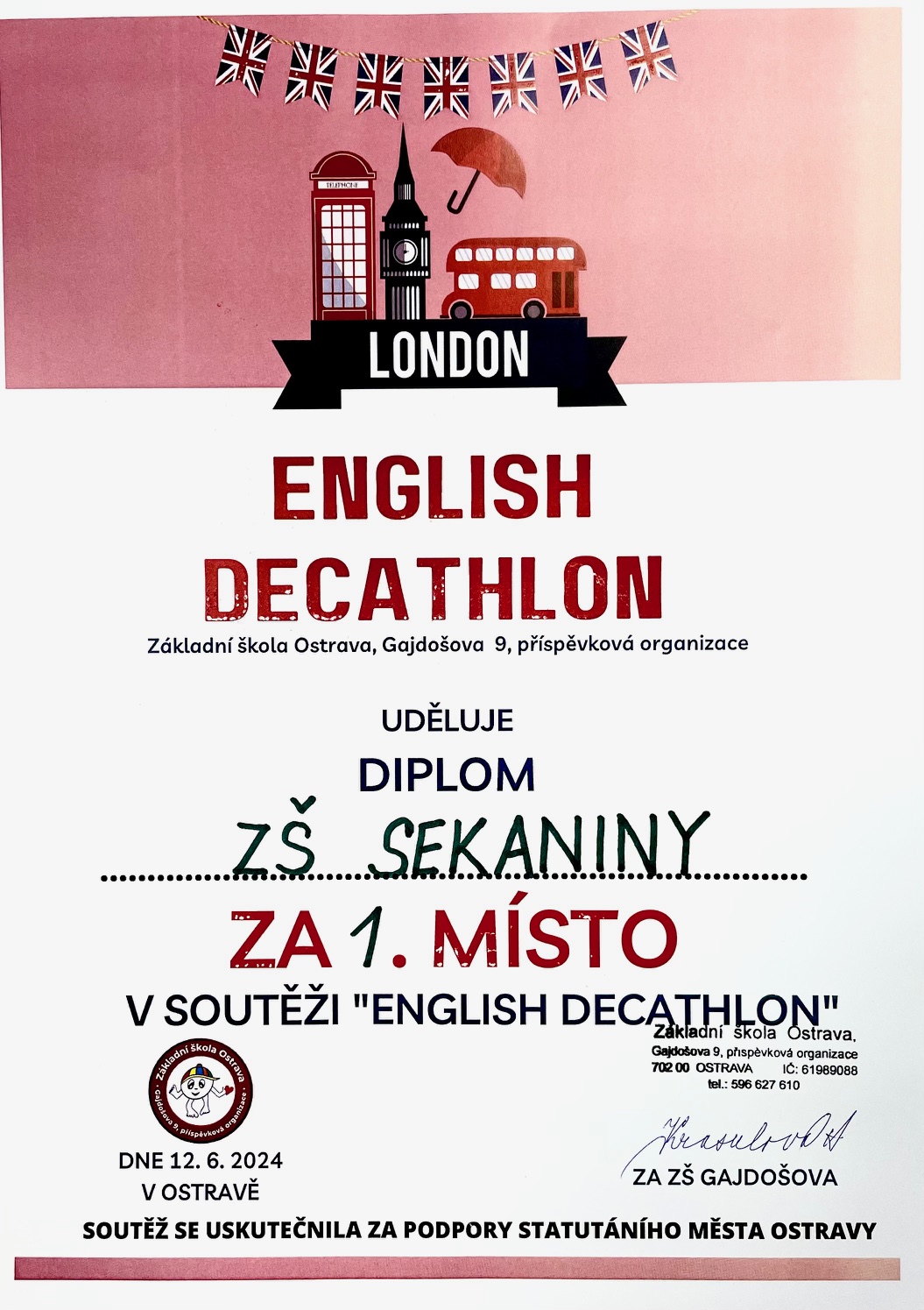 V letošním roce se žáci 1. stupně zúčastnili tří soutěží v anglickém jazyce. V 1. pololetí nás reprezentoval žák z 5. B v soutěži Oxford illustrator, kde prokázal nejen jazykové vědomosti, ale také výtvarné schopnosti, což mu vyneslo 1. místo. V dubnu se 4 žáci 4. tříd účastnili soutěže Let´s play with English, kde obsadili 5. místo. V červnu se konal Anglický desetiboj pro žáky 3. tříd. Naši školu reprezentovaly tři dívky, které v konkurenci 12 ostravských škol vybojovaly nádherné 1. místo!