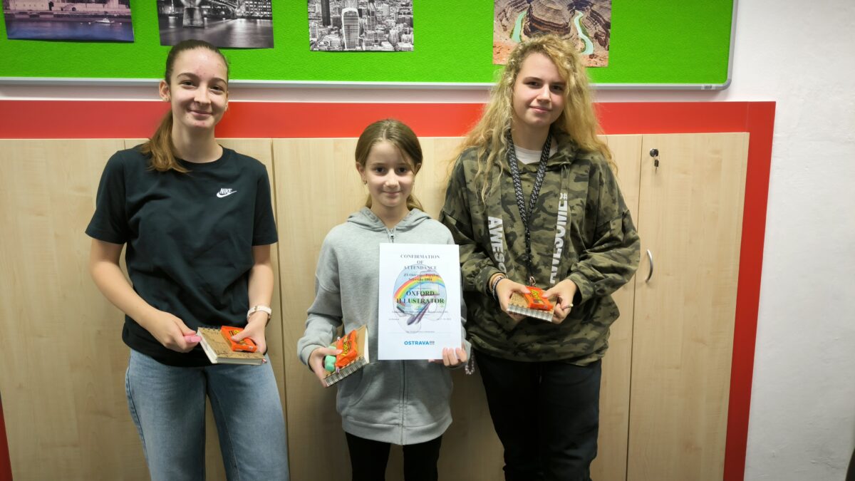 Tři zdatné výtvarnice Vali P., Katka Č. a Viki S. vyrazily ve čtvrtek 17. 10. na ZŠ Pokorného, aby v soutěži Oxford Illustrator porovnaly své ilustrátorské dovednosti s desítkami dalších mladých výtvarníků. I když se jim ilustrace na základě anglicky psaného textu moc povedla, na umístění to bohužel nestačilo. Holkám moc děkujeme za reprezentaci školy a věříme, že nabyté zkušenosti zúročí v příštím ročníku soutěže!