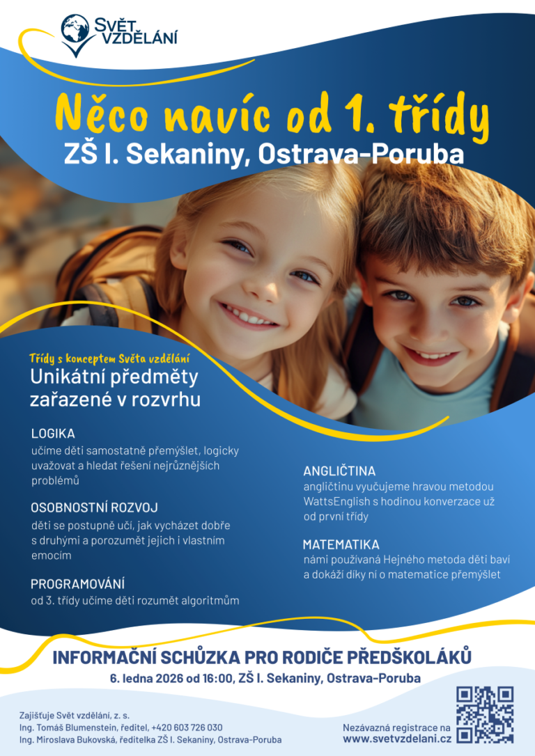 Více informací, termíny informačních schůzek a přihlášku najdete na webu: https://svetvzdelani.cz/
